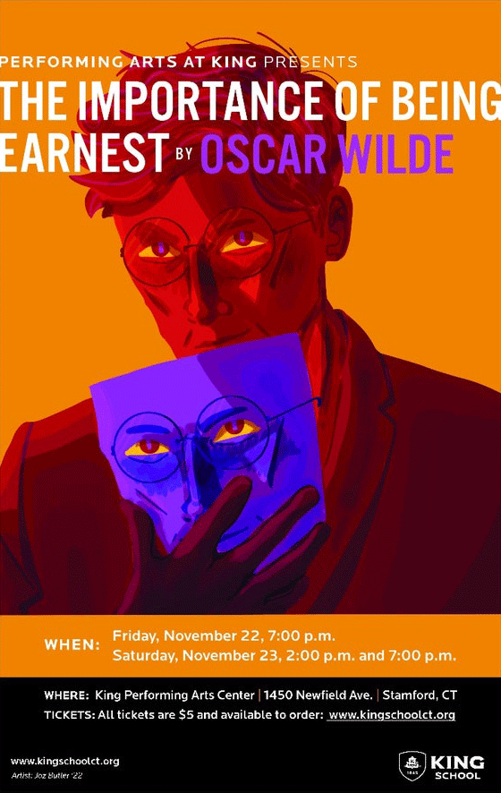 Another theme present in the deeper meaning of this painting is the balance between complex imagery and simple presentation. The mask went through a lot of iterations and it finally landed on the mirror image of Jack’s face pretty close to the end of the process. It sums up the rift within Jack’s character in a succinct little package, and the small differences between the real face and the mask tell an entrancing story. The mask also points quite nicely to all of the contradictions within Jack, like with his Christian name and his real identity. The last real impactful meaning with the mask is that it is semi-representative of Algernon as well. His struggles align closely with Jack’s underneath all his witty banter and flashiness, and this piece brings both of them together. While Jack isn’t so much trying to hide, he is cognizant of the fact that he performs for people, just like the actors in this play.